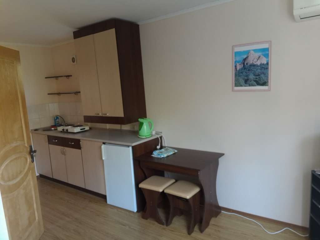 Расположен в гаражном кооперативе АГК «Подкова», практически на берегу моря. Внизу гараж для крупного автомобиля, вверху — оборудованная мебелью и бытовой техникой двухкомнатная квартира-студия. Не требует дополнительных вложений. Электричество, вода, канализация, бойлер, спутниковое TV, интернет рядом, 2 кондиционера. Земельный участок под гаражом 30 м2 в собственности.