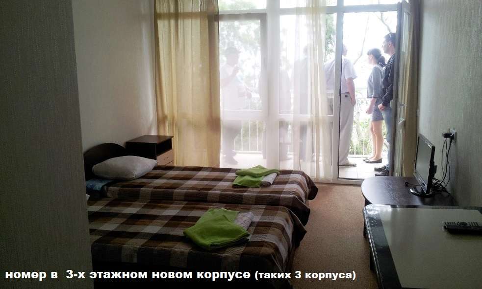 Однокомнатный номер с частичными удобствами(туалет, умывальник) и видом на море. В номере холодильник, две(три) кровати, шкаф для одежды.