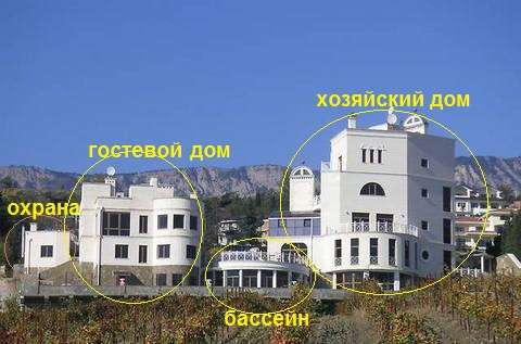 В усадьбу входит два дома соединенные крытым бассейном с подогревом, котельная, домик для охраны, общая площадь всех построек 971,3 кв.м.