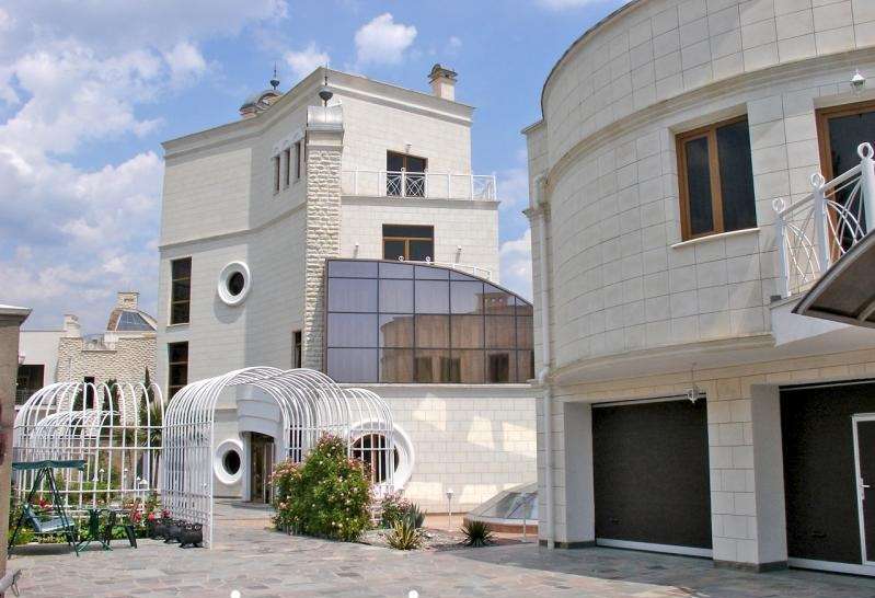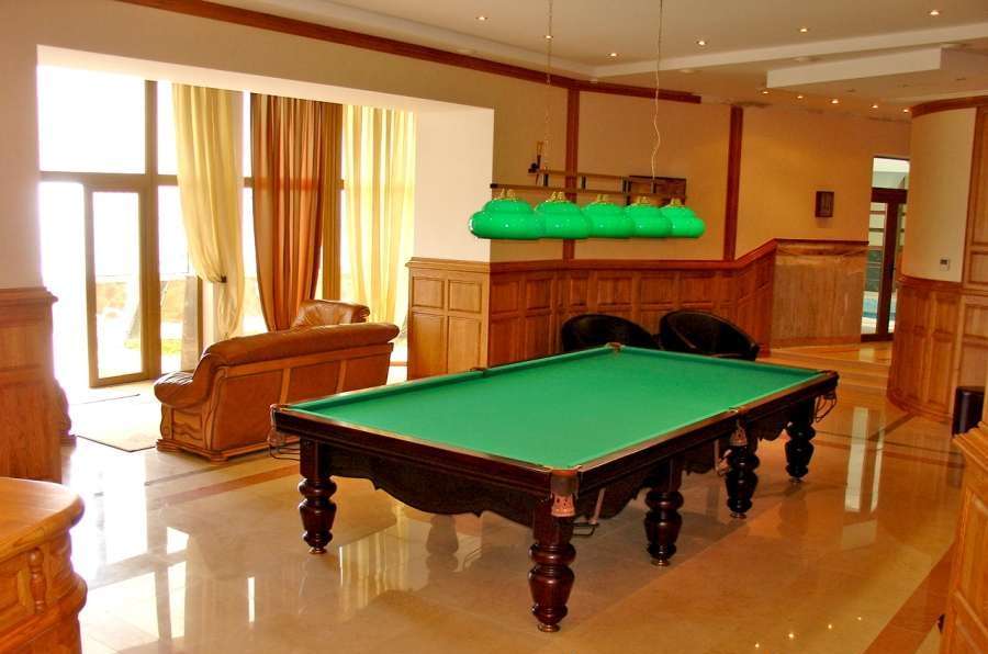 Основной дом с эксклюзивной внутренней отделкой и итальянской мебелью. Снаружи дом отделан мрамором. На первом этаже расположена основная инфраструктура для отдыха: бассейн с подогревом воды и панорамными окнами, открывающимися в летний период площадью 150 кв.м, сауна, бильярдная, мини бар. Также в доме есть спортзал под стеклянным куполом с видом на море.