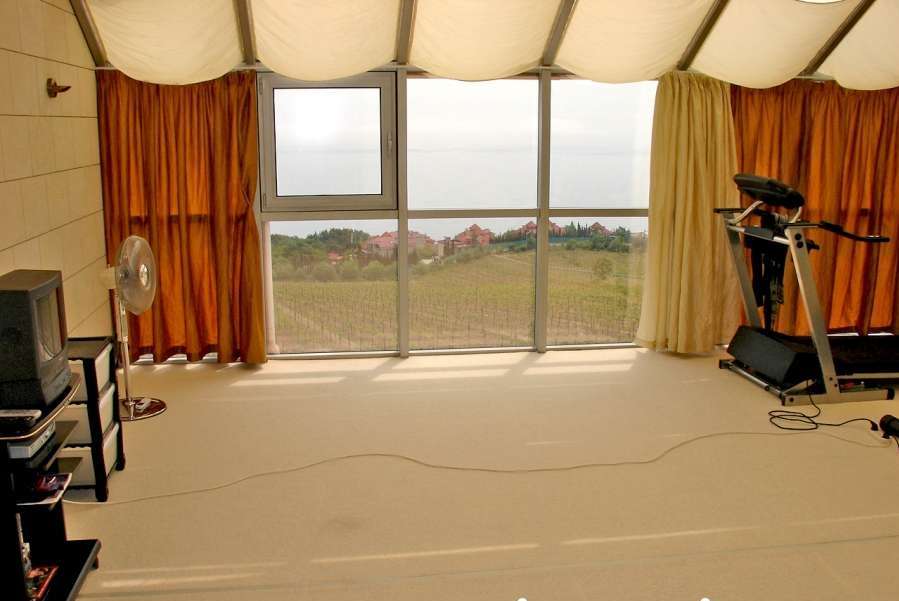 Основной дом площадью 428,9 кв.м.. 1 этаж : бильярдная комната, бар, сауна, душ и санузел, выдох к бассейну и джакузи; 2 этаж: гостиная со смотровыми окнами, кухня, санузел; 3 этаж: спальная, душ, санузел, спортзал; 4 этаж: комната для отдыха, ванная, санузел, балкон; 5 этаж: кабинет в дереве, сауна, душ, санузел, камин, балкон, винтовая лестница ведущая на смотровую площадку.