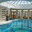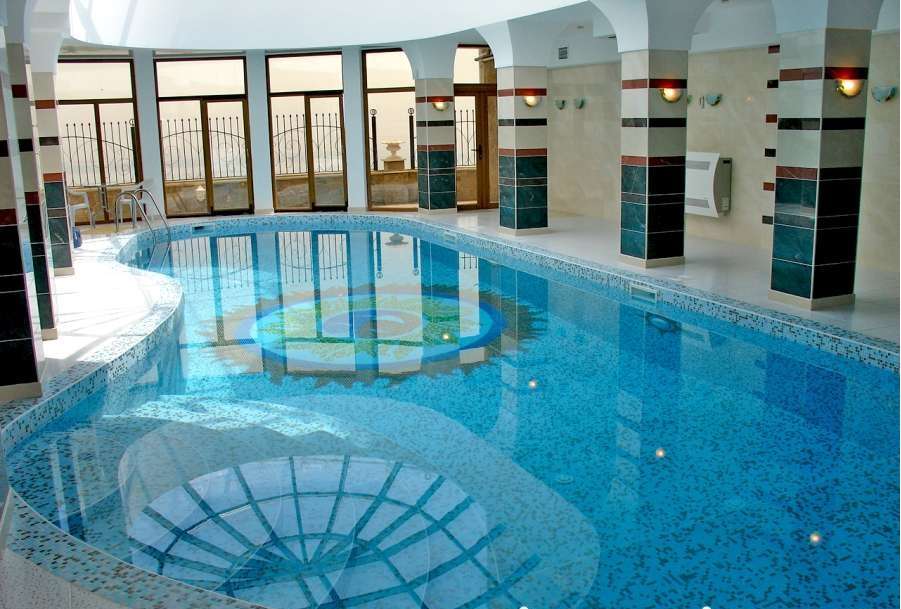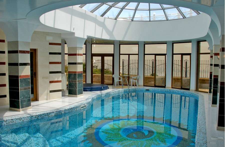 Бассейн площадью 149,4 кв.м., водоизмещением 108 куб, крытый стеклянной крышей, гараж на 2 машины.